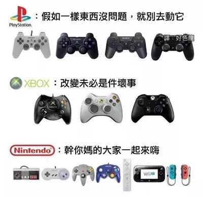 從GameCube之後,任天堂放棄了高性能主機理念,開始向差異化發展。用“遙控器”來玩的體感主機Wii、手柄上帶塊擴展螢幕的的WiiU、將主機掌機合二為一的Switch、還有將主機與紙板結合的Labo,這些產品每次出現的時候都會讓玩家們眼前一亮。創新精神可以說是任天堂整個公司一貫以來的堅持,從之前網上瘋傳的那張手柄對比圖裡你就能感覺出來: