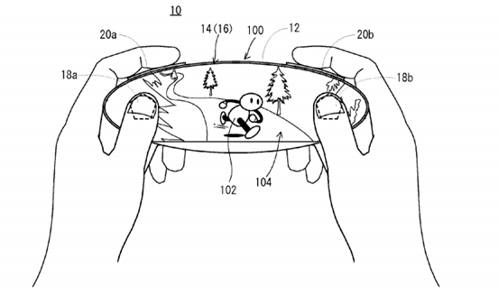 不過有趣的是,這並不是只是一個普通的手柄:整個手柄的A面由一整塊液晶屏構成,而且在搖杆部分挖了兩個洞,使螢幕看起來與手柄部分融為一體。從專利圖上來看,有時操作提示會直接出現在搖杆和肩鍵附近的螢幕上,道具欄也可以依此來設計,比起常規的手柄操作更加直觀一些。