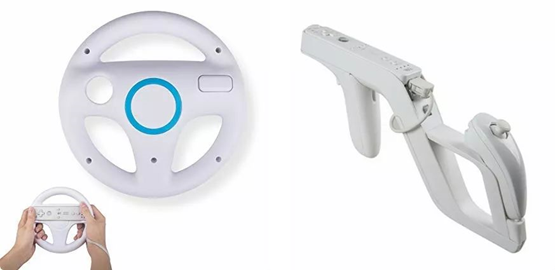 Wii的遙控器手柄和雞腿手柄實在太過另類了,結合體感使用,操作的方式也非常多。另外官方曾經為這一套手柄設計了各種外設,比如方向盤、光槍外殼Wii Zapper等等。